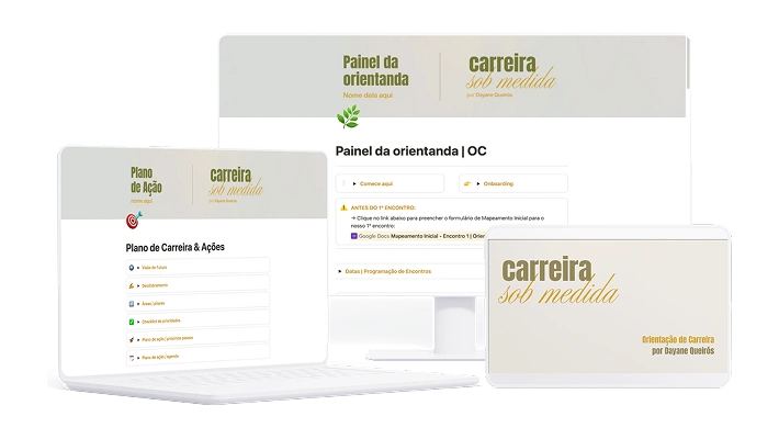Não. É um processo de orientação de carreira. A diferença? Eu não te entrego um plano pronto nem te digo “faz isso”. A gente constrói juntas, com método, clareza e intenção.
