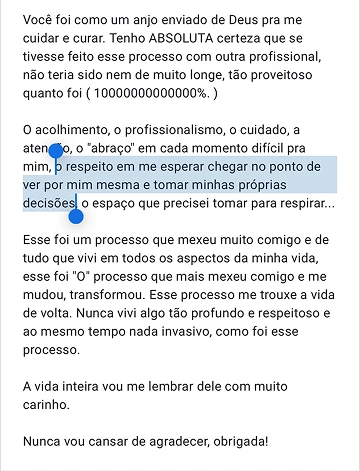 “O respeito em me esperar chegar no ponto de ver por mim mesma e tomar minhas próprias decisões. […] Esse foi o processo que mais mexeu comigo e me trouxe à vida de volta.”