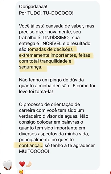 “Tomadas de decisões extremamente importantes, feitas com total tranquilidade e segurança. […] O processo com você tem sido um verdadeiro divisor de águas.”