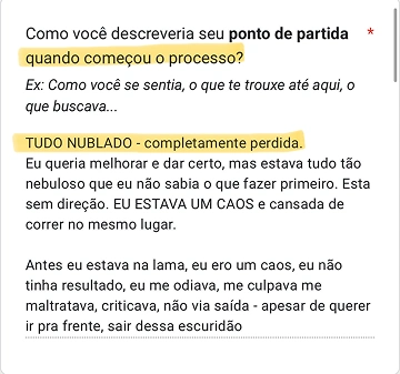 “TUDO NUBLADO – completamente perdida […] EU ESTAVA UM CAOS e cansada de correr no mesmo lugar.”